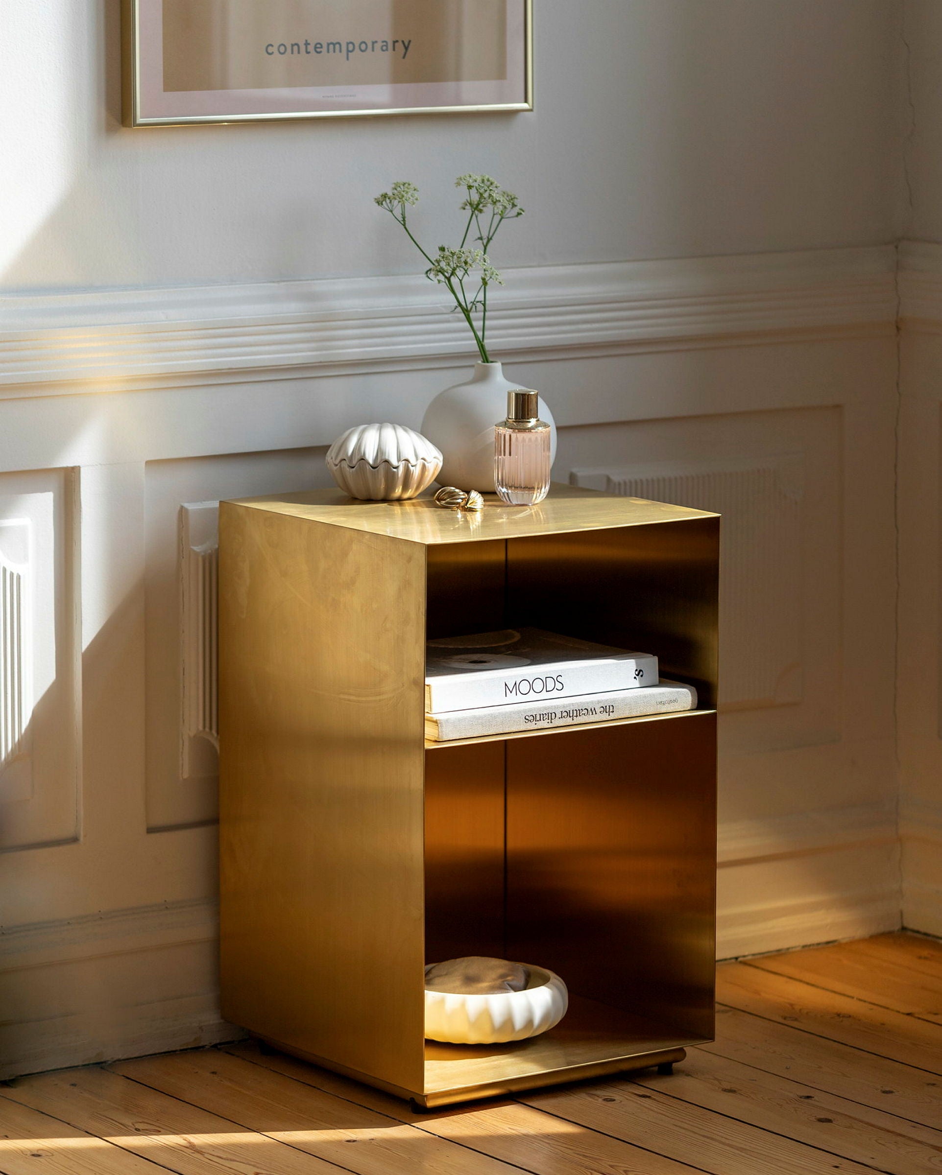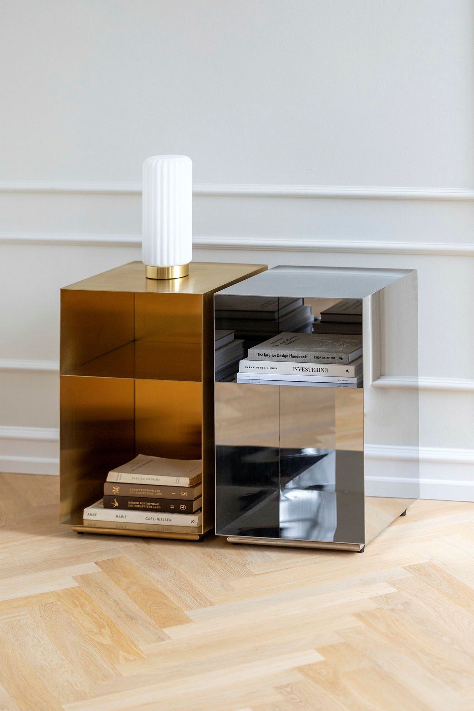Holme Sängbord Classic kombinerar modern minimalistisk design och raka linjer med funktionalitet. Sängbordet kommer med ett generöst integrerat förvaringsutrymme. Finns i fyra utföranden – polerad krom, borstad mässing, mattsvart och valnötsträ.
