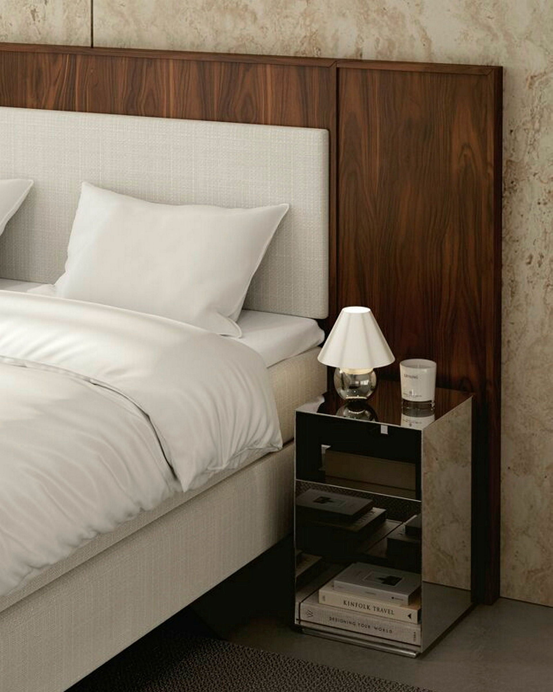 En storslagen sänggavel i valnöt med rena linjer kombinerat med en klädd ryggpanel. Anpassa genom att välja bland många tyger i olika färger och texturer. Handgjord i Sverige.
