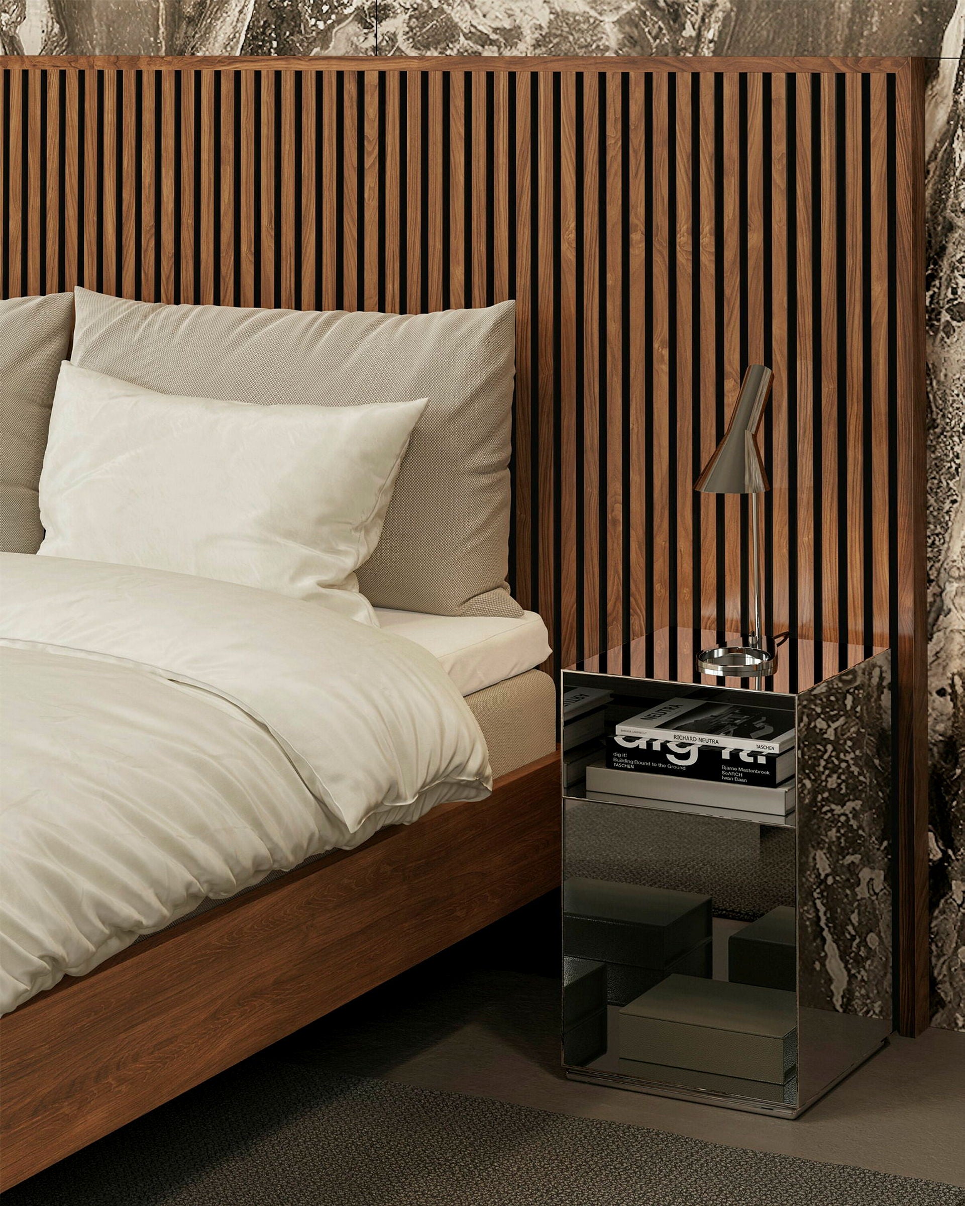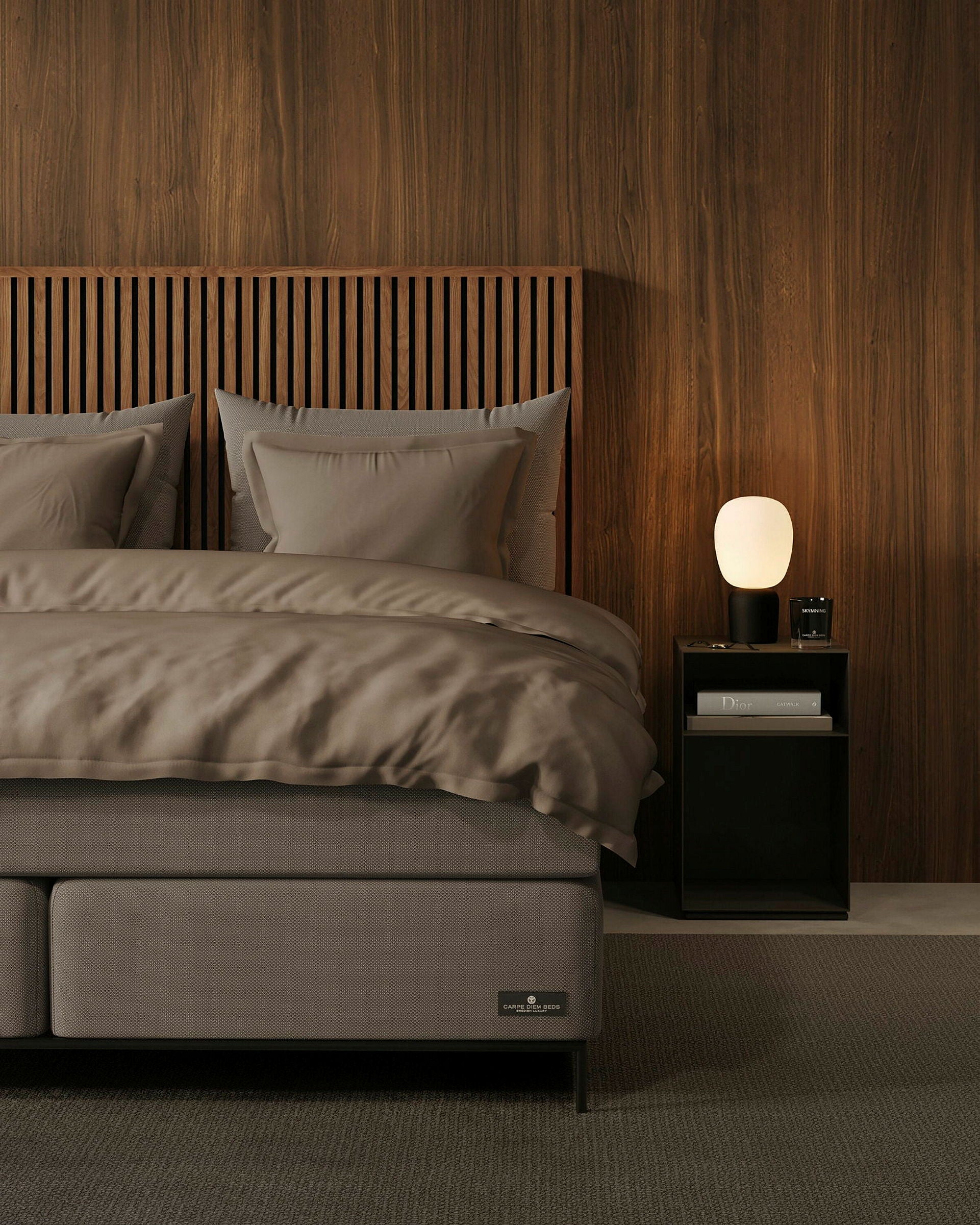 Förvandla ditt sovrum till en avkopplande fristad med den eleganta sänggaveln Pinnö. Tillverkad av vertikala valnötspaneler utstrålar Pinnö värme och elegans, och skapar ett djärvt men kuraterat intryck.