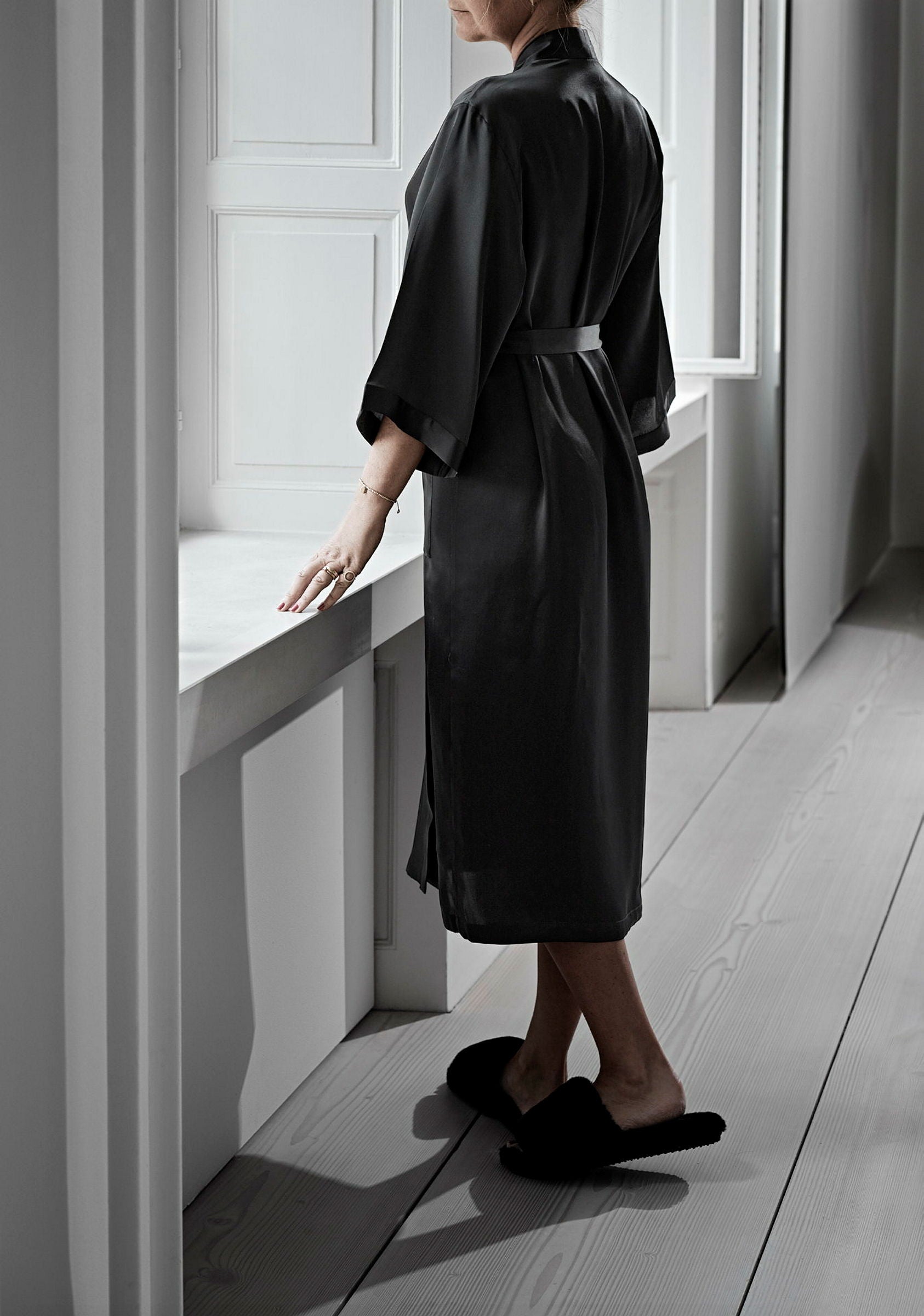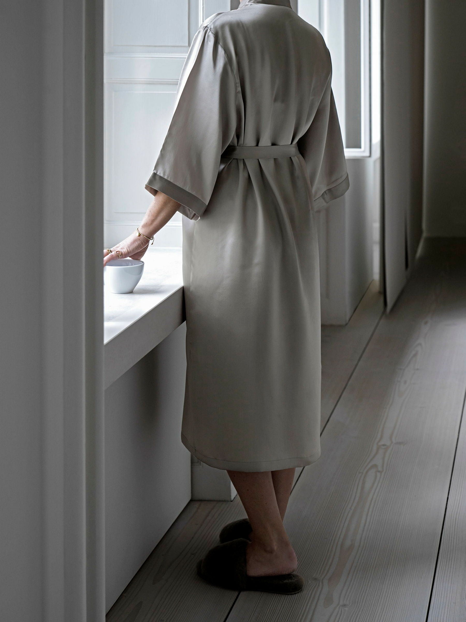Vår exklusiva kimono i finaste siden adderar en känsla av vardagslyx när du bär den. Den förhöjer både din morgon- och kvällsrutin och passar även utmärkt att bära när du tar det lugnt hemma. Svep den runt din kropp och upplev den oemotståndligt mjuka och sköna känslan av äkta mullbärssilke mot din hud.